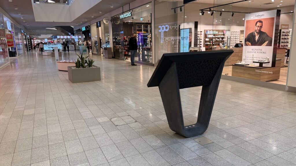 W wyniku realizacji powstała trwała, estetyczna i funkcjonalna podstawa do kiosku multimedialnego, która doskonale komponuje się z wnętrzem galerii handlowej w Warszawa.