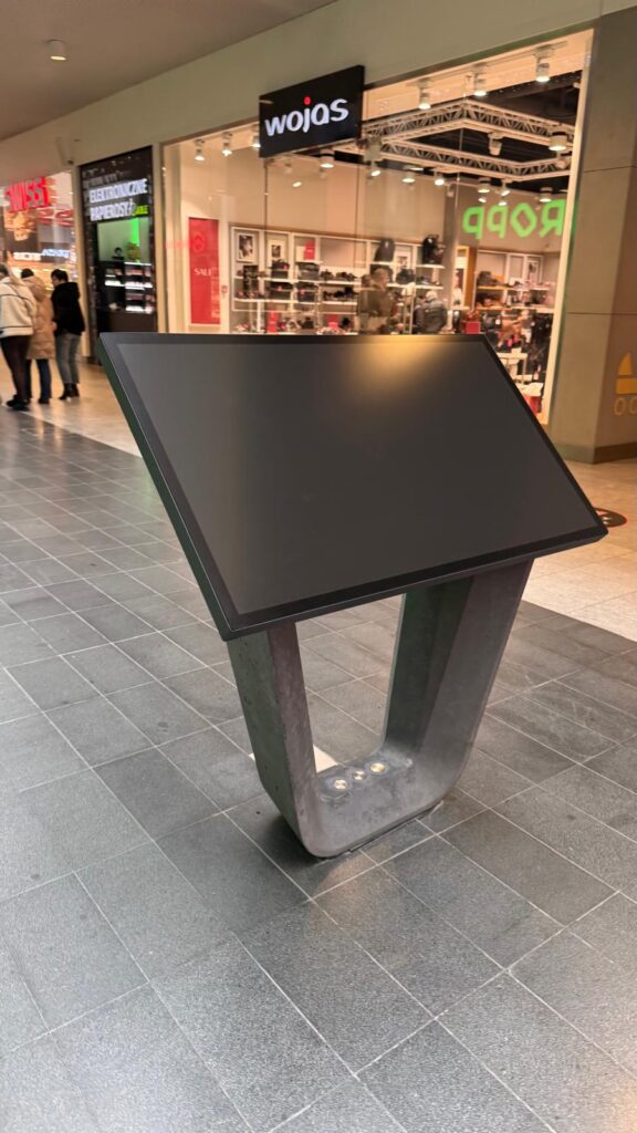 Celem realizacji było stworzenie trwałej, estetycznej i stabilnej podstawy, która integruje się z przestrzenią galerii handlowej, zapewniając bezpieczeństwo i nowoczesny wygląd kiosku multimedialnego.