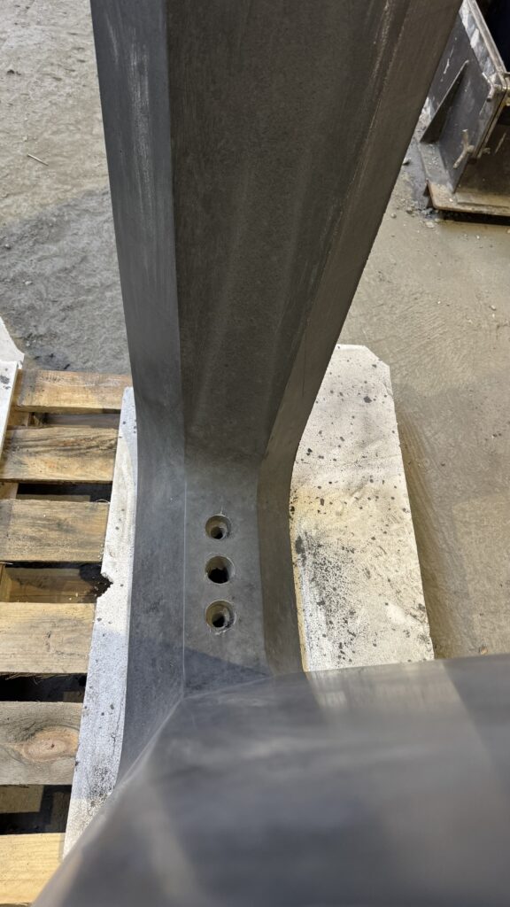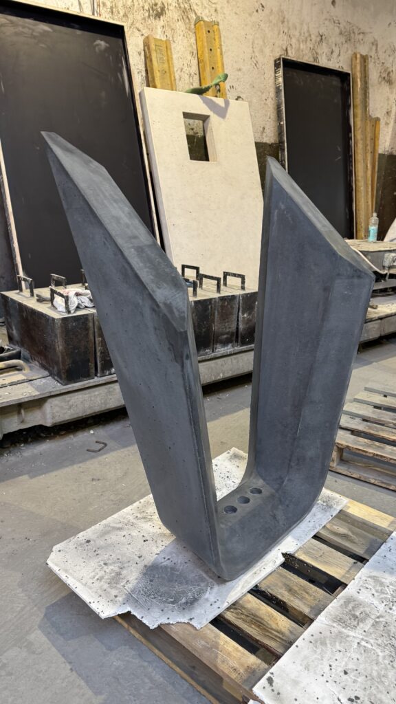 Element łączy w sobie precyzję wykonania, nowoczesny design i trwałość materiału, pokazując możliwości betonu architektonicznego w projektach prefabrykowanych o nietypowych kształtach.